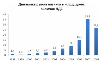 где: Кап - коэффициент поправок по авансовым платежам. Однако эту сумму следует считать основной, но не полной. Необходимо также учитывать такие элементы лизинговых платежей, как рисковая премия; плата за предусмотренные в лизинговом договоре дополнительные услуги лизингодателя; плата за страхование лизингового имущества, если оно застраховано лизинговой компанией и другие. В заключение следует отметить, что приведенные методики расчета лизинговых платежей не могут рассматриваться как универсальные. Каждая конкретная лизинговая сделка требует индивидуального подхода. 3. РАЗВИТИЕ ЛИЗИНГА В РОССИИ Прошедший 2008 год для финансового рынка следует поделить на два периода. В «мажорном» отрезке первого полугодия, пока сохранялась иллюзия отката кризисных явлений, наблюдался небольшой прирост объема заключенных сделок, что логично, учитывая обычную сезонность рынка. Второе полугодие стало периодом «краха надежд». Объем нового бизнеса по итогам 9 месяцев 2008 года составил 319,7 млрд рублей без НДС, что составляет всего 62 процента от показателя 2007 года. Четвертый квартал оказался наиболее сложным периодом: резкое сужение рынка корпоративного кредитования, падение рублевой ликвидности, замораживание выплат клиентами (рис. 1).