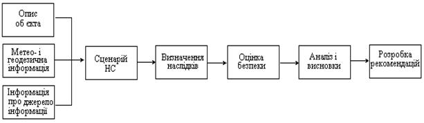 При щільності забудови до 7% пожежі практично не поширюються. При щільності забудови від 7 до 20% можуть поширюватися окремі пожежі, а понад 20% імовірне виникнення суцільних пожеж. Орієнтовно можна приймати, що виникнення і розвиток пожежі (утворення суцільної пожежі) у будинках I, II і III ступенів вогнестійкості [2, 3] можливо при надлишкових тисках вибуху 30—50 кПа, а в будинках IV і V ступенів — до 20 кПа. 2. Стійкість об’єкта і шляхи її підвищення Під стійкістю роботи промислового об'єкта розуміють здатність об'єкта випускати установлені види продукції в умовах НС, а також пристосованість цього об'єкта до відновлення у випадку ушкодження. Аналізують стійкість і уразливість елементів об'єкта в умовах НС, а також оцінюють небезпеку виходу з ладу чи руйнування елементів або всього об'єкта в цілому. На цьому етапі аналізують: - надійність установ і технологічних комплексів; - наслідки аварій окремих систем виробництва; - поширення ударної хвилі по території підприємства при вибухах ємкостей, комунікацій; - поширення вогню при пожежах; - розсіювання речовин, що вивільняються при НС; - можливість вторинного утворення токсичних, пожежо- і вибухонебезпечних сумішей і т.ін. Зразкова схема оцінки небезпеки промислового об'єкта представлена на рис.3.