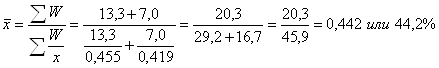 Расчет показателя средней стоимости валового регионального продукта в среднем на 1 руб. стоимости основных фондов в экономике проводим по средней гармонической взвешенной, так как неизвестен показатель стоимости основных фондов в экономике, находящийся в знаменателе. Весом выступает численность населения занятого в экономике.