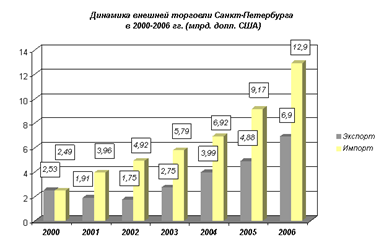 Рис. 6. Динамика внешней торговли Санкт-Петербурга в 2000-2006 гг. Объем экспорта вырос на 41,5%, импорта – на 41,7%. Сальдо внешней торговли отрицательное – 6 млрд. долларов США. Рост экспорта наблюдается с 2003 года, но вместе с тем растет отрицательное сальдо торгового баланса. Внешняя торговля Санкт-Петербурга ориентирована преимущественно на страны дальнего зарубежья. Соотношение товарооборота Санкт-Петербурга со странами дальнего зарубежья и со странами СНГ - 95:5 соответственно. В торговле со странами дальнего зарубежья по сравнению с прошлым годом не произошло изменений в соотношении экспорт/импорт, а в торговле со странами СНГ увеличилась экспортная составляющая. В 2006 году предприятия Санкт-Петербурга осуществляли торговлю со 180 странами (из них 10 - страны СНГ). Крупнейшие торговые партнеры Санкт-Петербурга – Германия, Китай, Нидерланды, Финляндия, США. Соотношение экспорта стран дальнего зарубежья и СНГ: 90:10. По сравнению с 2005 годом доля стан дальнего зарубежья увеличилась, а доля стран СНГ соответственно уменьшилась на 1%. Из стран СНГ традиционно наиболее активные партнеры – Украина и Казахстан, из стран дальнего зарубежья лидируют Нидерланды (21% от общего экспорта), Китай (12%), Германия (12%). Во II квартале 2006 г. в Санкт-Петербурге зарегистрировано подразделение ОАО “Сибнефть” ОАО “Газпром нефть”, которое лидирует по объемам внешнеторгового оборота. В товарной структуре экспорта произошли существенные сдвиги: удельный вес минеральных продуктов вырос на 25%. При этом удельный вес машин и оборудования, а также металлов и изделий из них сократился на 14 и 10% соответственно. Крупнейшие предприятия-экспортеры Санкт-Петербурга: ОАО “Газпром нефть”, ОАО Cудостроительный завод "СЕВЕРНАЯ ВЕРФЬ", ФГУП “Адмиралтейские верфи”, ЗАО "АЙ БИ ЭС", ЗАО "К. СТЕЙНВЕХ (Санкт-Петербург) ЛТД, ЗАО "Петромакс", филиал ОАО "Силовые машины”, ООО “Океан”, ЗАО “Вторчермет”