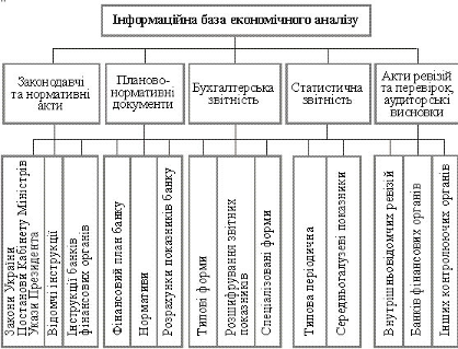 Рис.1.2. Склад інформаційної бази економічного аналізу комерційного банку Інформація, яка використовується при аналізі діяльності банку, повинна відповідати таким вимогам: доступність, значущість, матеріальність, надійність і порівнянність. Далі необхідно ознайомитися з коротким змістом кожної вимоги до інформації, що використовується у процесі аналізу діяльності комерційного банку. Доступність передбачає, що інформація, яка входить у фінансові звіти, має бути зрозумілою для користувача з певним рівнем знання бізнесу, економіки і бухгалтерського обліку. Складну інформацію, яка необхідна для повного розкриття ситуації, слід надавати найбільш зрозумілим способом. Під значущістю розуміють те, що інформація у фінансовій звітності повинна бути корисною для прийняття рішень економічного характеру. Для того щоб інформація була значущою, вона має бути матеріальною. Інформація є матеріальною, якщо її ненадання або неправильне подання може вплинути на рішення економічного характеру. Надійність інформації забезпечується в тому разі, коли вона не містить матеріальних помилок. Надійність інформації передбачає: правдиве уявлення, тобто позиція фінансової звітності забезпечує правдиве її подання, якщо вона може бути оцінена з достатньою точністю, щоб бути корисною; перевагу змісту над формою. Іншими словами інформація повинна надаватися відповідно до її економічної користі, а не просто за її юридичною формою. Нейтральність - інформація має бути вільною від упередженості, її подання у фінансовій звітності не повинно бути вибірковим для досягнення попередньо встановленого результату. Для того щоб відповідати таким вимогам як надійність і значущість, фінансова звітність повинна містити інформацію, яка базується на певних розрахунках (наприклад, можливість повернення боргів, строки "життя" виробничих активів). З метою уникнення матеріальної недооцінки або переоцінки позицій фінансової звітності при розрахунках необхідно керуватися принципом "обережності". Порівнянність фінансової звітності забезпечується у тих випадках, коли: є можливість порівняти фінансову звітність комерційного банку, що аналізується, з аналогічною звітністю інших комерційних банків для порівняльного оцінювання їх фінансового стану і результатів їхньої діяльності; можна порівняти фінансову звітність комерційного банку протягом певного періоду для визначення тенденцій у фінансовому стані і результатах діяльності банку. Дотримання наведених вимог до фінансової звітності комерційних банків перевіряється в процесі перевірки її достовірності. Перевірка звітності може бути: формальна; логічна; обліково-контрольна. Формальна перевірка звітності банків передбачає перевірку повноти складу наданих документів відповідно до їх складу, передбаченого Правилами організації фінансової та статистичної звітності банків України, які затверджені постановою Правління Національного банку України від 12.12.1997 р. № 436. Крім того, за формальної перевірки звітності перевіряється правильність її оформлення відповідно до вимог, викладених у згаданій вище постанові Національного банку України. Логічна перевірка передбачає перевірку взаємоув'язки ідентичних показників у різних формах звітності. Обліково-контрольна - це перевірка правильності розрахунку окр