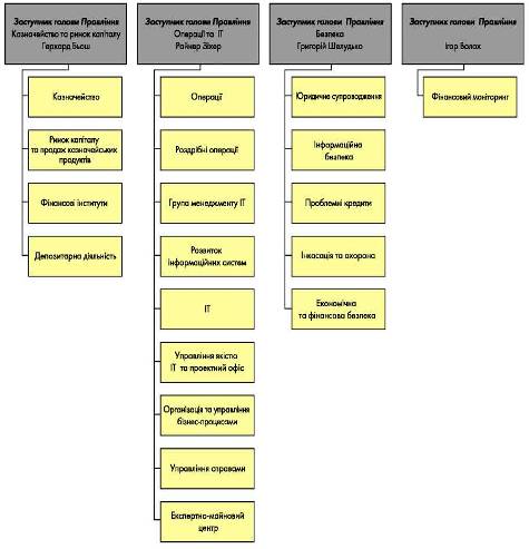 Рис.1.1.Структура акціонерів банку Організаційна модель банку складається з 25 Департаментів, 14 самостійних Управлінь і відділів, Казначейства, групи менеджменту інформаційних технологій, виконавчого секретаріату, групи регіонального менеджменту, служби з питань недержавного пенсійного забезпечення, експертно-майнового центру. Банк має ефективну структуру управління, побудовану на чіткому розподілі на бізнес - лінії (корпоративний бізнес, роздрібний бізнес, малий та середній бізнес, казначейство та підрозділ з надання послуг фінансовим інститутам) та вертикалі підтримки (інформаційні технології та операційна підтримка, контролінг, безпека та інші), які створені на рівні Центрального офісу та обласних дирекцій банку. «Райффайзен Банк Аваль» має чітке розмежування функцій фронт - офісу та бек - офісу, що підвищує якість обслуговування клієнтів та сприяє зменшенню ризиків. Організаційна структура банку постійно вдосконалюється з тим, аби й надалі забезпечувати швидке прийняття рішень, оптимізувати витрати та поліпшити якість обслуговування клієнтів по всій Україні. Схема організаційної структури банку наведено в додатку А. Загальнонаціональна мережа «Райффайзен Банк Аваль» включає 1 377 структурних підрозділів, розташованих у великих містах, обласних та районних центрах, містах обласного підпорядкування та окремих селах у всіх регіонах України. Переважна більшість із них є повнофункціональними відділеннями, що надають приватним та корпоративним клієнтам повний перелік стандартних та новітніх банківських послуг на найвищому рівні. Високоякісне оперативне обслуговування клієнтів по всій Україні забезпечується власними мережами наземного цифрового та супутникового зв′язку, системою електронного обігу, використанням новітніх банківських та інформаційних технологій у бізнес-процесах Банку. На стадії впровадження знаходиться інтегрована система роздрібного бізнесу на основі програмного комплексу Bankmaster RS. Банк здійснює свою діяльність в межах наданих Національним банком ліцензій та дозволів і надає клієнтам великий спектр банківських послуг. Види діяльності, які здійснює банк відповідають Статуту банку. Предметом діяльності Банку є виконання банківських та інших операцій, згідно з наданими Національним банком України ліцензіями та дозволами. Стратегічна мета Банку - вийти на якісно новий рівень обслуговування клієнтів, бути гідним фінансовим інститутом на міжнародному рівні. Основною метою діяльності банку є одержання прибутку в інтересах Банку та його акціонерів. «Райффайзен Банк Аваль» розвивається як роздрібний універсальний банк з потужною корпоративною вертикаллю, здатною ефективно обслуговувати підприємства великого, малого та середнього бізнесу. Сьогодні «Райффайзен Банк Аваль» є провідним в Україні банком, що пропонує приватним клієнтам максимально повний перелік банківських послуг, зокрема споживче кредитування (у тому числі за спеціальними програмами - товари у розстрочку, автомобілі у кредит), грошові перекази у національній та іноземних валютах з відкриттям і без відкриття рахунку, розміщення коштів на депозитних рахунках, повний набір сучасних платіжних інструментів - пластикові картки міжнародних систем Europay International і Visa International. Для корпоративних клієнтів «Райффайзен Банк Ав
