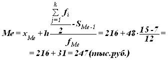 Вывод. В данном случае наибольший процент предприятий по уровню производительности труда приходится на интервал от 216 до 264, а само значение средней характеризуется 246 (тыс.руб.) Медиана (Ме) – это вариант, который находится в середине вариационного ряда. Медиана делит ряд на две равные (по числу единиц) части – со значениями признака меньше медианы и со значениями признака больше медианы. Чтобы найти медианы, необходимо отыскать значение признака, которое находится в середине упорядоченного ряда. Определяем медианный интервал, используя графу 5 табл. 4. Медианным интервалом является интервал 216-264 тыс.руб., т.к. именно в этом интервале накопленная частота Sj=19 впервые превышает полу-сумму всех частот