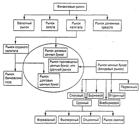 Рис. 1. Основные сегменты рынка денежных средств Прежде всего следует упомянуть о дисконтном рынке как обобщающей характеристике рынка, на котором продаются и покупаются векселя. Этот рынок играет особую роль в денежно-кредитном регулировании экономики, а его значение заключается в обеспечении равномерного притока денег в экономику. Операторами дисконтных рынков являются центральный банк и коммерческие банки. Важным сегментом денежного рынка является рынок межбанковских кредитов (МБК), на котором коммерческие банки кредитуют друг друга. Межбанковские кредиты предоставляются в форме продажи излишка средств коммерческого банка на резервном счете в центральном банке сверх определенной законом величины обязательных резервов и в форме сделок «РЕПО». Рынок евровалют представляет собой часть денежного рынка, на котором осуществляется торговля краткосрочными финансовыми инструментами, номинированными в евровалютах. В развитых странах существует также рынок депозитных сертификатов. Депозитные сертификаты представляют собой свидетельства о крупных срочных вкладах в банках и являются ценной бумагой. Поскольку срок обращения депозитных сертификатов, как правило, не превышает один год, эти бумаги можно рассматривать как бумаги денежного рынка. 1.3 Инструменты финансового рынка В основе наиболее общего деления финансовых рынков на рынки денежных средств и рынки капитала лежит срок обращения соответствующих финансовых инструментов. В практике развитых стран считается, что если срок обращения финансового инструмента составляет менее года, то это инструмент денежного рынка.[4] Долгосрочные инструменты (свыше пяти лет) относятся к рынку капитала. Строго говоря, имеется «пограничная область» от одного года до пяти лет, когда говорят о среднесрочных инструментах и рынках. В общем случае они также относятся к рынку капитала. В России разделение на кратко- и долгосрочные финансовые инструменты несколько иное. К последним часто относят инструменты с периодом обращения более полугода. Таким образом, граница между краткосрочными и долгосрочными финансовыми инструментами, равно как и граница между денежными рынками и рынком капитала, не всегда может быть четко проведена. Вместе с тем такое деление имеет глубокий экономический смысл. Инструменты денежного рынка служат в первую очередь для обеспечения ликвидными средствами государственных организаций и сферы бизнеса, тогда как инструменты рынка капитала связаны с процессом сбережения и инвестирования. Примерами инструментов денежного рынка являются казначейские векселя, банковские акцепты, депозитные сертификаты банков. К инструментам рынка капитала, например, относятся долгосрочные облигации, акции, долгосрочные ссуды. Если в качестве финансового инструмента выступают долевые ценные бумаги, то эти отношения носят характер отношений собственности, в остальных случаях это кредитные отношения. На рынке ссудного капитала обращаются долгосрочные финансовые инструменты, предоставляемые на условиях срочности, возвратности и платности. Они включают в себя рынок долгосрочных банковских ссуд и рынок долговых ценных бумаг (также долгосрочных). Рынок евровалют представляет собой часть денежного рынка, на котором осуществляется торговля краткосрочными финансовыми инс
