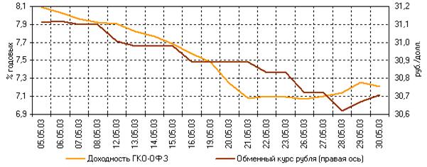 Рис.2.2.Котировки "бенчмарки" и остатки на корсчетах По итогам месяца номинальный обменный курс рубля впервые увеличился более чем на 1,2%, что стало дополнительным фактором вложения средств в активы с положительной доходностью к перепродаже. В мае динамика ставок по ГКО-ОФЗ в целом соответствовала изменениям обменного курса рубля (рис. 2.3), т.к. средства, полученные от продажи валютной выручки, практически сразу направлялись на фондовый рынок.