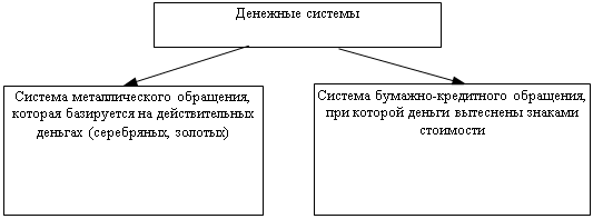 Рис.2.3 Элементы системы денежного обращения Денежная единица - это установленный в законодательном порядке денежный знак, который служит для соизмерения и выражения цен всех товаров и услуг. Она, как правило, делится на мелкие пропорциональные части. В большинстве стран действует десятичная система деления (1 доллар равен 100 центам, 1 англ. Фунт равен 100 пенсам и т.д.). Масштаб цен - это выбор денежной единицы страны. Виды денежных знаков - это кредитные деньги и в первую очередь банкноты, разменная монета, а также бумажные деньги. Например, в США в обращении находятся банковские билеты в 100, 50, 20, 10, 5, 2 и 1 доллар, а также серебряно-медные и медно-никелевые монеты в 1 доллар, 50, 25, 10 и 1 цент. Эмиссионная система - это законодательно установленный порядок выпуска и обращения денежных знаков. Эмиссионные операции в государствах осуществляют: ЦБ, пользующийся монопольным правом выпуска банковских билетов (банкнота); казначейство (государственный исполнительный орган), выпускающее мелкокупюрные бумажно-денежные знаки (казначейские билеты и монеты из дешевых видов металла). Современная денежная система зарубежных стран характеризуется следующими чертами: 1. отменой золотого содержания денежных единиц и демонетизацией золота; 2. переходом к не разменным на золото кредитным деньгам, немногим отличающихся по своей природе от бумажных денег; 3. выпуском банкнот в обращение в порядке кредитования хозяйства, государства, а также под прирост официальных золотых и валютных резервов; 4. развитием в денежном обращении безналичного оборота; 5. усилением государственного регулирования денежного обращения. Таким образом, денежная система представляет собой устройство денежного обращения в стране, которое сложилось исторически и закреплено национальным законодательством. Элементами денежной системы выступают денежная единица, масштаб цен, виды денежных знаков, порядок эмитирования и регулирования. Денежная система - это форма организации денежного обращения в стране, сложившаяся исторически и закрепленная национальным законодательством. Денежные системы сформировались в XVI-XVII вв. с возникновением и утверждением капиталистического способа производства, хотя отдельные их элементы появились в более ранний период. По мере развития товарно-денежных отношений и капиталистического способа производства происходят существенные изменения в денежной системе. Тип денежной системы зависит от того, в какой форме функционируют деньги: как товар - всеобщий эквивалент или как знаки стоимости. В связи с этим выделяют следующие типы денежных систем: системы металлического обращения, при которых денежный товар непосредственно обращается и выполняет все функции денег, а кредитные деньги разменны на металл; [7] системы обращения кредитных и бумажных денег, при которых полноценные деньги вытеснены из обращения. В зависимости от металла, который в данной стране был принят в качестве всеобщего эквивалента, и базы денежного обращения различаются биметаллизм и монометаллизм. Биметаллизм - денежная система, при которой роль всеобщего эквивалента закрепляется за двумя благородными металлами (обычно за золотом и серебром), предусматриваются свободная чеканка монет из обоих металлов и их неограниченное обращение. При системе параллельной валюты соотношение 