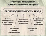 Одним из факторов повышения производительности труда является разделение труда и специализация. Прежде чем определить, что такое разделение труда и специализация, необходимо обратить внимание на то, все сферы экономической деятельности, все отрасли экономики тесно связаны между собой, зависят друг от друга. Например, уже отмечалась связь между производством и потреблением. Взаимозависимость отраслей и сфер экономики находит отражение в понятии общественного производства. Общественное производство - это часть экономической системы, представляющая собой множество предприятий, отраслей производства, сфер экономики, связанных между собой в единое целое разделением труда и специализацией. Таким образом, разделение труда лежит в основе целостности национальной экономики. Разделение труда - такая система труда, которая складывается в результате дифференциации труда, то есть расчленения трудовой деятельности на части, приводящей к обособлению различных видов труда. Разделение труда возникает и развивается под воздействием научно-технического прогресса. Разделение труда способствует росту производительности труда. Работник, сосредоточивая свои усилия на производстве отдельной детали или на отдельной операции, повышает своё мастерство, изобретает более совершенную технологию, ориентированную на сокращение времени производства детали. В масштабах общества это даёт огромный эффект. Рассматривая разделение труда, обычно упоминают специализацию производства ("разделение труда и специализация производства"). Специализация производства есть результат разделения труда. Она выражается в увеличении количества особых, самостоятельных операций и видов производства, числа предприятий, производящих более узкий ассортимент продукции. Например, если в 60-е годы на металлургическом комбинате производились практически все виды чёрного металла, то в настоящее время существует множество относительно небольших специализированных предприятий по производству особых видов чугуна и стали. Главный признак специализированного предприятия - это однородность выпускаемой продукции. Важным фактором, влияющим на производительность труда, является кооперация труда. Чем более глубоким является разделение труда и более узкой становится специализация производства, тем в большей степени производители становятся взаимозависимыми, тем больше необходима согласованность и координация действий между различными производствами. Чтобы действовать в условиях взаимозависимости, необходима кооперация труда как в условиях предприятия, так и в условиях всего общества. Кооперация труда - это единство, согласованность совместных действий производителей, различных производств и отраслей экономики. Кооперация труда позволяет избежать множества ошибок, например, дублирования производства, перепроизводства. С другой стороны, согласованность и координация действий, объединение множества усилий позволяет сделать то, что не под силу одному производителю или одному предприятию. В случае простой кооперации труда, которая имеет место, например, при строительстве домов, гидростанций, полезный эффект кооперации очевиден. Кооперация труда имеет место во всех сферах экономической деятельности, она принимает самые разнообразные формы. Таким обр