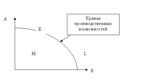 Рис. 1. Модель производственных возможностей экономики Каждая точка на кривой производственных возможностей представляет какой-то максимальный объем производства двух продуктов. Чтобы осуществить различные комбинации производства «А» и «В», показанные на кривой, общество должно обеспечить полную занятость ресурсов и полный объем производства. В модели раскрываются четыре основные идеи: - ограниченность ресурсов подразумевает, что выпуск продуктов осуществим только при вариантах производства, находящихся внутри или на кривой производственных возможностей; - возможность выбора находит выражение в необходимости для общества проводить отбор из разных достижимых комбинаций продуктов; - нисходящий наклон кривой подразумевает наличие альтернативных затрат; - выгнутость кривой показывает увеличение альтернативных затрат с ростом производства какого-либо продукта. Все сочетания «А» и «В» на кривой представляют максимальные их количества, которые могут быть получены лишь в результате наиболее эффективного использования всех имеющихся ресурсов. Полное использование ресурсов – это ситуация, когда рост одного результата может идти только за счет уменьшения другого результата. Данная ситуация называется «эффективностью по Парето», в честь итальянского экономиста В. Парето, который сформулировал суть полного или эффективного использования ресурсов. Точки, находящиеся выше кривой производственных возможностей (L), оказались бы предпочтительнее любой точки на кривой, но они недостижимы при данном количестве ресурсов и при данной технологии производства в экономике страны. Барьер ограниченности ресурсов не допускает какого-либо сочетания производства средств производства и предметов потребления в точке, расположенной выше кривой производственных возможностей. В «Макроэкономике» рассматривается экономическая деятельность домохозяйств, фирм и государства как экономических агентов. Анализ этой деятельности базируется на выделении альтернативных вариантов экономических целей и способов их реализации. Так, в основе экономического выбора домохозяйств лежит альтернатива потребления товаров/ресурсов или сбережения их для использования в будущем. Возможен и другой вариант альтернативы, перед которой оказывается домохозяйство, - вариант сбережения ресурсов или инвестирования их в какие-то экономически выгодные, приносящие прибыль проекты. В основе экономической деятельности фирмы, получающей доход от экономической деятельности, лежит альтернатива между оплатой труда или капитализацией прибыли. Государство как экономический агент также оказывается в ситуации, когда необходимо принимать решение о выборе политики распределения и перераспределения доходов. В основе экономического выбора государства лежит альтернатива: либо соблюдать социальную справедливость, поддерживая равенство в обществе, создавая условия одинакового «стартового уровня» для граждан, либо поддерживать эффективного собственника, выстраивая соответствующую налогово-кредитную политику. Цена решения неоднозначна. Так, стремление к большему равенству может обернуться для общества потерями в экономической эффективности, разрушением стимулов к труду. С другой стороны, падение уровня жизни, глубокое неравенство даже с ожиданием поло