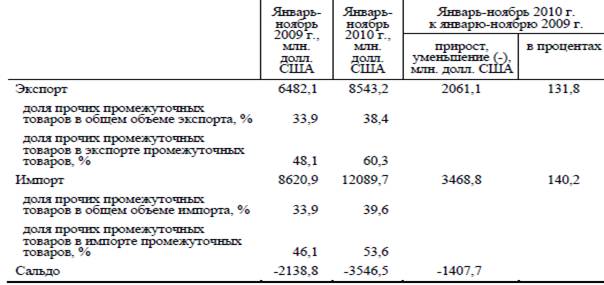 Основными источниками формирования отрицательного сальдо внешней торговли товарами являются экспортно-импортные операции с промежуточными товарами (энергоносители, сырье, материалы и комплектующие). В январе-ноябре 2010 г. в страну ввезено промежуточных товаров на сумму 22,6 млрд. долларов, или на 20,6% больше, чем за соответствующий период предыдущего года. Экспорт промежуточных товаров составил 14,2 млрд. долларов, что на 5,2% больше, чем в январе-ноябре 2009 г. Величина отрицательного сальдо внешней торговли промежуточными товарами увеличилась с 5238,8 млн. долларов в январе-ноябре 2009 г. До 8382,6 млн. долларов в январе-ноябре 2010 г. Данные об объемах экспорта и импорта промежуточных товаров приведены в следующей таблице: