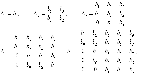 При составлении определителей по указанной схеме, коэффициенты с индексом, превышающим степень характеристического уравнения, заменяют нулями. Согласно критерию Рауса – Гурвица, найдем определители характеристического уравнения ЗСАУ: