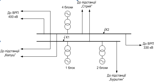 1.4 Схема видачі потужності Від розподільчих пристроїв БуТЕС відходять 9 ЛЕП напругою 110-400 кВ. Лінія 110 кВ приєднана до Бурштинської підстанції і забезпечує енергією навколишні райони. Лініями 220 кВ БуТЕС зв’язана з Калуською і Стрийською підстанціями по дві лінії на кожну. За допомогою ліній 330 кВ станція здійснює транзит потужності до двох великих обласних центри Тернополя та Івано-Франківська. Лінією 400 кВ, яка з’єднує станцію з підстанцією «Мукачеве», здійснюється експорт електроенергії закордон.
