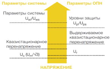 Рис 13. Процедура вибору ОПН. Um - Клас напруга мережі. Uc - Найбільша робоча напруга. Ur - Номінальна напруга ОПН. TOV - тимчасові перенапруження. T - Коефіцієнт тимчасових перенапружень. до - Коефіцієнт замикання на землю. Ups - Захисний рівень при комутаційних перенапруженнях. Upl - Захисний рівень при грозових перенапруженнях. Uws - Рівень ізоляції при комутаційних перенапруженнях. Uwl - Рівень ізоляції при грозових перенапруженнях Таблиця 23. Основні дані
