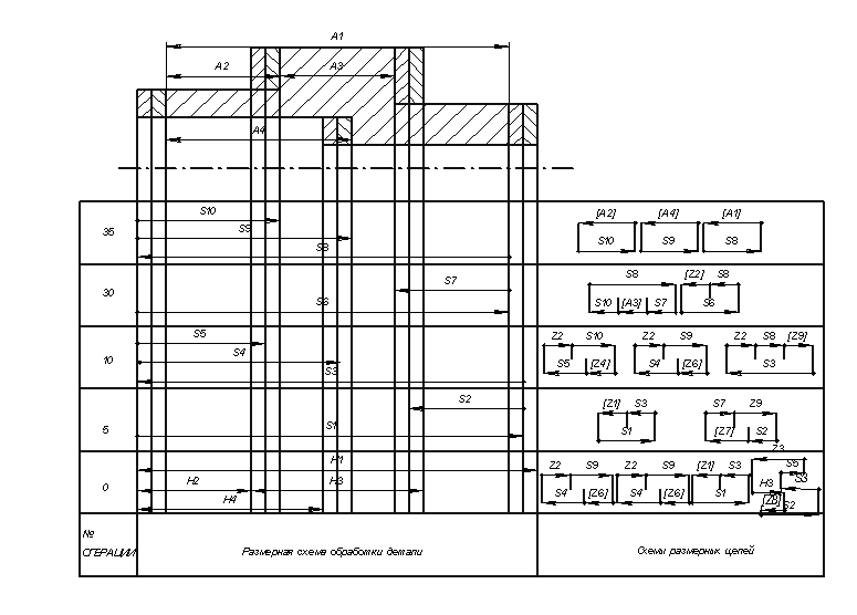 7.2 Разработка и анализ размерной схемы обработки торцевых поверхностей детали Расчёт линейных операционных размеров начинают с построения размерной схемы технологического процесса. Основой для построения схемы служит план технологического процесса. Размерную схему необходимо строить, располагая эскизами плана обработки детали, следующим образом. Вычерчивают контур готовой детали, утолщёнными линиями указывают координаты торцов поверхностей в соответствии с координацией размеров на рабочем чертеже. С учётом количества обрабатываемых торцевых поверхностей на эскизе детали условно показывают операционные припуски вплоть до соответствующего размера заготовки. Затем все исходные, промежуточные и окончательные торцевые поверхности нумеруются слева направо. Через пронумерованные поверхности проводятся вертикальные линии. Между вертикальными линиями, начиная с последующей операции, с учётом эскизов обработки, указывают технологические размеры (обозначаем Sn). Размер представлен в виде стрелок с точкой, причём точка совмещена с установочной базой, а стрелка своим остриём упирается в ту поверхность, которую мы получили на данной операции, после снятия соответствующего межоперационного припуска. После построения размерной схемы мы можем составить размерные цепи. В качестве замыкающих звеньев выступают конструкторские размеры или размеры припусков, в качестве составляющих, искомых звеньев, выступают операционные размеры, которые функционально связывают торцевые поверхности на всех операциях от заготовительной до окончательной. Размерная схема представлена на рис. 7.1