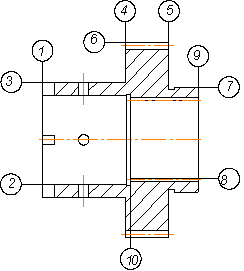 Рис.1 Схема нумерации основных поверхностей детали Деталь имеет 10 основных поверхностей. 3. Выбор метода получения заготовки 3.1 Обоснование выбранного метода получения заготовки Выбор метода получения заготовки является многовариантной задачей. С точки зрения сокращения затрат времени и средств на механическую обработку целесообразно выбирать заготовки, которые по форме, размерам, точности и качеству поверхности возможно полнее соответствовали бы параметрам готовой детали. Но при этом будут увеличиваться текущие и единовременные затраты на получение заготовки в заготовительном цехе. С другой стороны, упрощением формы заготовки, снижением требований к ее точности и качеству можно значительно уменьшить затраты на ее изготовление. Но в этом случае снизится коэффициент использования материала и увеличатся затраты на обработку такой заготовки в механическом цехе. Основными факторами, определяющими вид заготовки, являются материал детали, ее конфигурация, габаритные размеры и, что немаловажно, условия ее работы. Исходя из осесимметричной формы детали, а также необходимости получения для дальнейшей ее обработки благоприятного распределения внутренних напряжений, заготовку получаем штамповкой на кривошипном горячештамповочном прессе. Это связано со следующими преимуществами данного метода: - повышенная точность размеров получаемых на КГШП поковок из-за постоянства хода пресса и определенности нижнего положения ползуна, что позволяет уменьшить отклонения размеров поковок по высоте, поковки также не контролируют на сдвиг. Жесткое и надежное направление ползуна КГШП и применение штампов с направляющими колонками и втулками ограничивает относительные сдвиги верхней и нижней частей поковки до десятых долей миллиметра, что повышает точность горизонтальных размеров поковки. - увеличение коэффициента использования материала вследствие более совершенной конструкции штампов, снабженных верхним и нижним выталкивателями, что позволяет уменьшить штамповочные уклоны, припуски и напуски и тем самым приводит к экономии металла и уменьшению последующей обработки поковок резанием. Колебания вертикальных размеров поковок при штамповке на прессах объясняется различной величиной упругих деформаций штампа и пресса в связи с колебаниями температуры и объема заготовки, но тоже не составляет значимой величины. Уменьшение штамповочных уклонов (внутренние штамповочные уклоны 3˚; наружные штамповочные уклоны 2˚) позволяет получить более совершенную форму заготовки, а значит уменьшить припуски на механическую обработку и повысить коэффициент использования материала. - более высокая производительность данного метода по сравнению с молотами, что важно в условиях серийного производства; - снижение себестоимости продукции за счет снижения расхода металла и эксплуатационной стоимости. Для того, чтоб деталь была технологичной, необходимо выполнить такие требования: 1) использовать высокопроизводительные технологические методы обработки; 2) обработку поверхностей по возможности необходимо осуществлять без специального инструмента и оборудования; 3) Деталь должна иметь поверхности, удобные для установки; 4) заданные точность и шероховатость поверхностей должны быть обоснованы и соблюдено требование соответствия между 