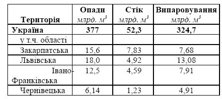 Загальний стік західних областей складає понад 35% стоку всіх рік України, а половина з нього припадає на річки Закарпаття, хоча його площа становить лише 2,1% площі держави. Частина цього стоку формується на румунській, угорській, словацькій територіях бассейну р. Тиса. Так, ріки Вішеу та Іза з румунської території впадають в р. Тиса вище м. Тячів, ріки Красна та Самош із угорської території також впадають у р. Тиса в низинній зоні (вище м. Чоп), а річки Убля й Улічка зі словацької території є правобережними притоками р. Уж поблизу смт. В.Березний.Загало м ріки, що формуються в Українських Карпатах, належать до трьох великих річкових басейнів, а саме р. Вісла, яка впадає в Балтійське море та рік Дністер і Дунай, які впадають у Чорне море. Річки Закарпаття мають типово гірський характер: русла мають значний ухил, швидку та бурхливу течію (до 3-5 м/с), незначну глибину (0,5-1,5 м). Так, р. Чорна Тиса має нахил 19 м/км, потік Говерла 75 м/км, ріка Брустурянка – 100 м/км. В середньому за рік спостерігається до 20 піків підняття рівня води в річках Закарпаття. Влітку живлення рік відбувається в основному за рахунок дощів, навесні – снігове і дощове, восени – дощове і підземне. Ширина долини гірських річок залежить від рельєфу території (рис.2.3). Питома водність на 1 людину у Закарпатті значно перевищує середньоукраїнські показники. Водночас, в області відчутна нестача води, особливо для забезпечення населення. Однією з причин цього є великий річний стік води, яка переважно транзитом скидається через територію області у р. Тиса й далі в р. Дунай. Протягом року цей стік дуже нерівномірний. Майже 75% стоку припадає на весняні і осінні паводки і тільки 25% – на інші періоди року. У гідрологічному відношенні на стік дуже впливає стан і ландшафт території водозбору, характеристику якого приведено на (див. рис. 2.3). Для водозбірної території верхів’я басейну р. Тиса характерним є гірський ландшафт і значна залісненість території. Гірський ландшафт впливає як на перебіг атмосферних процесів (інтенсивність дощів, снігопадів тощо), так і на темпи стоку, розподіл водних ресурсів по території (через мережу гірських долин). Він також впливає через вертикальну поясність на формування ґрунтів та на продуктивність рослинного світу, тобто на екологічний стан гірських комплексів. Залісненість і стан лісів (які також тісно пов’язані з вертикальною зональністю, а в теперішній час значною мірою й з господарською діяльністю) впливають на формування клімату та на регулювання атмосферних опадів. Науковцями Карпатської дослідної станції на гірському лісогідрологічному стаціонарі поблизу м. Свалява встановлено, наприклад, що стиглі букові ліси затримують (і випаровують) на могутніх кронах бучин до 25% опадів, а вічнозелені смерекові деревостани – аж 37% від кількості опадів. Звичайно, решта опадів потрапляє під намет дерев і подальша їх участь у процесах транспірації, випаровування, переводу в ґрунтові стоки залежить від стану підстилки і ґрунту, від крутизни схилів, від кількості й інтенсивності опадів і т. ін. Важливо, щоб не формувався (або був незначним) поверхневий стік, який на знеліснених територіях може перевищувати 60% загальної кількості опадів, тоді як на заліснених майже не виражений або незначний (до 3%). Тобто заліснені території зменшують поверхневий стік у багато десяткі