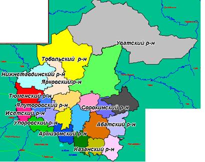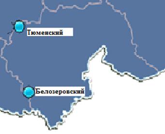 Рисунок 1. Карта Тюменской области. Смещение относительно UTC составляет +5:00 (YEKT, зимнее время) / +6:00 (YEKTST, летнее время), так как в этом часовом поясе действует переход на летнее время. Относительно Московского времени часовой пояс имеет постоянное смещение +2 часа и обозначается в России соответственно как MSK+2. Екатеринбургское время отличается от поясного времени на один час, так как на территории России действует декретное время. Согласно Указу Президиума Верховного Совета СССР от 14 августа 1944 г. состояла из следующих районов: Абатский, Армизонский, Аромашевский, Байкаловский, Бердюжский, Вагайский, Велижанский, Викуловский, Голышмановский, Дубровинский, Исетский, Ишимский, Казанский, Маслянский, Нижнетавдинский, Новозаимский, Омутинский, Сорокинский, Тобольский, Тюменский, Уватский, Упоровский, Юргинский, Ялуторовский, Ярковский районы. Города областного подчинения: Ишим, Тобольск, Тюмень. Указом Президиума Верховного Совета РСФСРот 9 июля 1960 г. упразднён Байкаловский район. Указом Президиума Верховного Совета РСФСР от 28 апреля 1962 г. упразднены Велижанский и Новозаимский районы. Указом Президиума Верховного Совета РСФСР от 1 февраля 1963 г. образованы укрупнённые сельские районы: Абатский, Бердюжский, Вагайский, Голышмановский, Ишимский, Казанский, Омутинский, Тобольский, Тюменский, Ялуторовский. Упразднены Армизонский, Аромашевский, Викуловский, Дубровинский, Исетский, Маслянский, Нижнетавдинский, Сорокинский, Уватский, Упоровский, Юргинский и Ярковский районы. Г. Ялуторовск отнесен к городам областного подчинения. Указом Президиума Верховного Совета РСФСР от 4 марта 1964 г. образован Нижнетавдинский сельский район. Указом Президиума Верховного Совета РСФСР от 12 января 1965 г. сельские районы преобразованы в районы. Дополнительно образованы Армизонский, Викуловский, Заводоуковский, Сладковский, Сорокинский, Уватский и Ярковский районы. Указом Президиума Верховного Совета РСФСР от 30 декабря 1966 г. образованы Исетский и Упоровский районы. Указом Президиума Верховного Совета РСФСР от 9 декабря 1970 г. образованы Аромашевский и Юргинский районы. 7 октября 1977 г. в соответствии с вновь принятой Конституцией национальные округа получили статус автономных. Указом Президиума Верховного Совета РФ от 23 марта 1992 г. г. Заводоуковск отнесён к городам областного подчинения. Таблица 1. Районы и районные центры Тюменской области