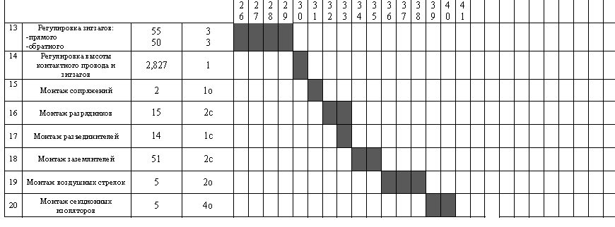 2.4 Составление плана-графика производства строительных работ При составлении плана-графика необходимо учесть: разрешается задействовать не более двух комплектов техники одного наименования; общая численность рабочих не регламентируется, но необходимо добиваться равномерного распределения трудозатрат по дням; разрешается проводить работы с "поля" и с "пути" одновременно. План-график производства строительных работ по контактной сети станции представлен ниже. Таблица 2.4 План-график производства строительных работ