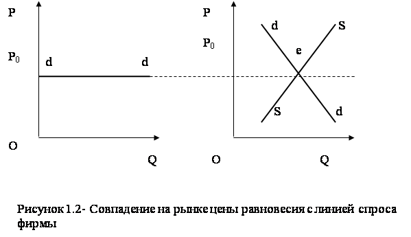 Это значит, что конкурентная фирма может продать любое количество товара по цене P0 или ниже ее. При рассмотрении графика спроса конкурентной фирмы возникает вопрос, как горизонтально расположенная линия спроса фирмы сочетается с отрицательным наклоном кривой спроса? Кривая спроса имеет отрицательный наклон, когда показываются все возможные комбинации выбора покупателя на рынке. Фирма, со своей стороны, может продать по цене равновесия любое количество единиц товара. Именно это и показывает горизонтально расположенная линия спроса фирмы (рис.1.2).