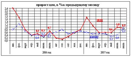 Аналогично рассматривается индекс реальных доходов, реальной заработной платы: (10) I реал.дох. (11) I р.з.п. наряду с исчислением ИПЦ возникает необходимость в расчете индекса цен предприятий – производителей промышленности, сельскохозяйственной, строительной и другой продукции. Индекс цен предприятий –производителей формируются на базе изменений цен этих предприятий. Наблюдение за изменением цен производителей продукции осуществляется по выборочной сети базовых предприятий различных форм собственности и организационно-правовых форм. Индекс цен производителей промышленной продукции характеризует динамику цен предприятия – производителей промышленной продукции. Расчет этих индексов осуществляется по набору товаров – представителей промышленной продукции, который включает важнейшие виды продукции отдельных отраслей, занимающие наибольшую долю в выпуске товарной продукции по данной отрасли. На рисунке 2 изображен график прироста цен в промышленности. Рис. 2