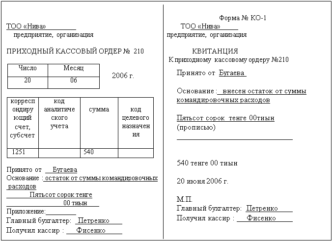 Суммы вознаграждения и арендных обязательств, 937,5 тыс. тенге и 1562,5 тыс. тенге, соответственно, дают в итоге 2500,0 тыс. тенге, т.е. общую сумму платежа по договору финансовой аренды. График арендных платежей можно привести в форме таблицы, в которой отражаются начисляемые проценты в конце каждого года и сокращение основного долга по годам и суммы амортизации. (Приложение 1) Распределение платежа на суммы вознаграждения и арендного обязательства производится: — на конец 1 года: 7500,0 х 12,5% = 937,5 — сумма вознаграждения; 2500,0 — 937,5 = 1562,5 — сумма арендного обязательства; — на конец 2 года: 5937,5 х 12,5% = 742,2 — сумма вознаграждения; 2500,0 — 742,2 = 1757,8 — сумма арендного обязательства и т.д. При этом ставка процента, подразумеваемая в договоре финансового лизинга, обеспечивает равенство между справедливой стоимостью и суммой дисконтируемой стоимости минимальных арендных платежей и негарантированной ликвидационной стоимости. Минимальные арендные платежи — это платежи, предусмотренные на срок аренды. 5 Учет задолженности работниковКраткосрочная дебиторская задолженность работников ТОО «Нива» может возникать по расчетам с командировочными и прочими подотчетными лицами, по возмещению материального ущерба, по расчетам за товары, проданные в кредит и по предоставленным займам. Эти расходы не всегда можно оплатить путем безналичных расчетов через учреждения банков, в силу чего для их оплаты и осуществления других аналогичных расходов работникам выдают в подотчет согласно расчету, утвержденному руководителем предприятия, наличные деньги. [14,с.293] Предприятия выдают своим работникам в подотчет суммы, которые используются подотчетными лицами для приобретения в магазинах канцелярских товаров, бланков, оплаты почтовых переводов и других расходов, необходимых для хозяйственной деятельности предприятия, а также эти средства используют для оплаты командировочных расходов. Авансы выдаются по необходимости в погашении расходов тем сотрудникам, на которых возложена обязанность осуществить расходы из подотчетных сумм и которых направляют приказом руководителя в командировки. Деньги на служебные командировки выдаются в пределах сумм, причитающихся командированным лицам, на оплату проезда (туда и обратно), суточных расходов и расходов по найму помещения, рассчитанных согласно сроку командировки. Отчетом об использованных суммах является авансовый отчет, который составляется не позднее 5 дней после выдачи денег на хозяйственные расходы или истечении срока командировки и представляется в бухгалтерию. Выдача последующих наличных средств подотчет производится при условии полного отчета по ранее выданным суммам. Бухгалтерская служба ТОО «Нива» удерживает из суммы оплаты труда работника не возмещенный им своевременно остаток аванса. Распоряжение об удержании подается не позднее одного месяца со дня окончания срока, установленного для возврата аванса. Пропустив этот срок, администрация теряет право на удержание соответствующих сумм в бесспорном порядке. В этом случае (если работник оспаривает основание или размер удержаний) взыскание сумм производится в судебном порядке. Проверенный авансовый отчет утверждается главным бухгалтером и руководителем предприятия. Неправильно заполненные авансовые отчеты и приложенные к ним документы возвращ