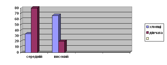 Нами було помічено, що результати дослідження нерівномірно розподілилися між представниками чоловічої та жіночої статі. Високі показники агресії характерні для 66,7% хлопців і лише 20% дівчат. Середнім рівнем володіють 33,3% хлопців та 80% дівчат (див. табл. 5). Таблиця 5. Рівні прояву комунікативної агресивності підлітків