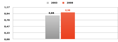 Существенно повышены безопасность и качество услуг, предоставляемых железнодорожным транспортом. Количество случаев нарушения безопасности движения с грузовыми и пассажирскими поездами снижено на 23%, средняя скорость доставки грузов возросла более чем на 22% Улучшаются качественные показатели использования подвижного состава. За период 2003-2009 гг.: среднесуточная производительность вагона выросла на 34% с 9352 до 12533 т-км нетто; среднесуточная производительность локомотива в грузовом движении на 14,1% с 1565 до 1786 тыс. т-км брутто. Существенно повышена внутренняя эффективность работы Российских железных дорог. Растущие объёмы перевозок выполнялись при оптимизации контингента, что позволило увеличить производительность труда более чем в 1,5 раза - вдвое выше, чем в экономике страны (1,24 раза) Рост производительности труда: