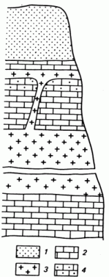 Рис. 3. Схематический разрез Аризонского месторождения хризотил-асбеста (по Б.Я.Меренкову, М.В.Муратову). 1 - песчаник; 2 - известняк; 3 - диабаз; 4 - серпентинит (с асбестом). Рис. 4. Поля развития амфибол-асбестов в ЮАР (по П.В.Харбену и Р.Л.Бейтсу с упрощенями).