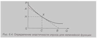 Для того чтобы геометрически определить эластичность спроса в какой-либо точке на графике, представленном прямой линией, необходимо сопоставить длины отрезков прямой от интересующей нас точки (например, точки X на Рис.6.3) до пересечения с осями координат. Продлим пунктирными линиями график спроса до точек его пересечения с осями количества и цены (точки В и А). Эластичность спроса в точке X можно рассчитать, разделив длину отрезка ХВ на длину отрезка ХА. Второй вариант вычисления эластичности в точке X - это соотношение длины отрезков ВС и ОС. Конечно, геометрически точка с единичной эластичностью находится посередине кривой спроса только на графиках функций, выраженных прямыми линиями. Для нелинейных функций наклон кривой постоянно изменяется, поэтому для определения эластичности геометрическим способом правила несколько другие. На Рис.6.4 изображен криволинейный график функции спроса. Чтобы определить эластичность спроса в точке X, необходимо провести касательную к кривой в данной точке, далее измерить отрезки касательной ХВ и ХА и разделить ХВ на ХА (или СВ на ОС). Понятно, что в каждой точке кривой касательная будет иметь разный наклон и получатся разной длины отрезки.