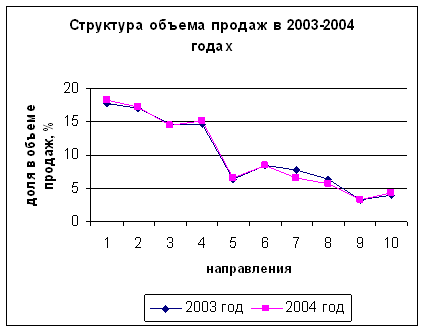 Направления: 1 – Турция; 2 - Египет; 3 - о. Крит (Греция); 4 – Таиланд; 5 – Испания; 6 – Хорватия; 7 - Франция. Париж; 8 - Италия (Рим, Венеция); 9 - Экс. тур в Грецию; 10 – Швейцария. Рисунок 5 – Динамика объема продаж турпутевок ООО «Марко Поло» Как видно из рис. 5, наиболее продаваемыми направлениями ООО «Марко Поло» в 2004 году были отдых в Турции, Египте, Таиланде. Менее всего пользовались спросом эксклюзивные туры в Грецию и Швейцарию. Также из рис. 5 видно тенденцию увеличения спроса на туристические путевки. Возможно, одной из причин этого является увеличение качества жизни населения. В табл. 6 представлен анализ структуры объема реализации ООО «Марко Поло» за 2003-2004 гг. Таблица 6 Структура объема реализации турфирмы ООО «Марко Поло» за 2003-2004 гг.
