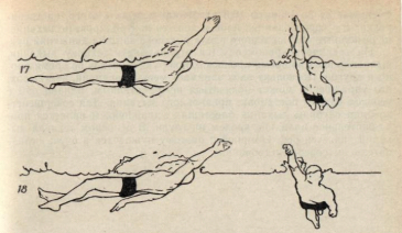 1.Положение левой кисти изменяется, ладонь проходит ближе к телу, чтобы начать отталкивание почти прямо вниз. Правая рука выполняет движение над водой. 2.Прямая левая рука заканчивает гребок, ее ладонь находится на расстоянии 3-6 дюймов (6,5-13 см) под бедром. Движение кисти вниз способствует подъему правого плеча. 3.При входе правой руки в воду ладонь "смотрит" наружу; левая рука начинает движение вверх, при этом ее ладонь направлена вниз. Многие пловцы при движении руки над водой выполняют вращение для того, чтобы ладонь оказалась повернутой внутрь, к средней линии тела. В этот момент руки не создают движущей силы. Рис.1 Техника плавания кролем на спине