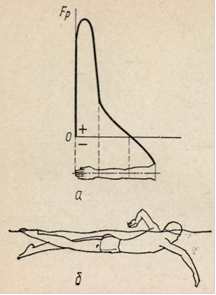 2-я половина главной фазы выделяется по усилиям и амплитуде движений. На эту часть фазы приходится завершение удара вверх стопой одной и начало удара вверх стопой другой ноги (в нашем примере это второй и третий удары). Во 2-й половине фазы внутрицикловая скорость достигает наибольшей величины. Заключительная фаза цикла кратковременна. Спортсмен завершает гребок захлестывающим движением кисти и предплечья вниз-назад (плечо гребковой руки остается в этот момент как бы фиксированным вдоль туловища), одновременно посылает вперед другую руку, входящую в воду, растягивая мышцы спины и груди к началу очередного гребка. Выполнить эти движения помогает окончание захлестывающего удара ногой вверх на стороне тела, противоположной руке, погрузившейся в воду. В заключительной фазе цикла пловец как бы передает гребок с одной руки на другую. Его тело принимает ровное (крен туловища отсутствует), хорошо уравновешенное и обтекаемое положение с минимальным углом атаки. В это же время выполняется, как правило, основная часть вдоха. [6] 5. Силы, вызывающие плавание способом "кроль на спине", их происхождение и взаимодействиеСпособы плавания основаны на взаимодействии пловца с водой, при котором создаются силы, продвигающие его в воде и удерживающие на ее поверхности. Взаимодействие возникает вследствие погружения тела в воду и активных движений пловца. Специфические особенности биодинамики плавания связаны с тем, что силы, тормозящие продвижение, значительны, переменны и действуют непрерывно. У пловца нет постоянной опоры для отталкивания вперед. Она создается во время гребковых движений. В настоящей главе излагаются условия создания сил и движущих, и тормозящих, а также механизм гребковых действий пловца, направленных на более эффективное передвижение в воде. Взаимодействие тела пловца с водой. Погружение в воду обусловливает возникновение сил статического взаимодействия (выталкивающая сила). Активные движения пловца и продвижение его в воде вызывают силы динамического взаимодействия (лобовое сопротивление, подъемные силы). Следовательно, положение тела пловца в воде и его движения обусловливают всю совокупность сил, которые решающим образом определяют эффективность плавания. Статическое действие водной среды. Силы, приложенные к плавающему телу. Погруженное в воду тело пловца находится под действием погружающей и выталкивающей сил; при их равенстве тело не всплывает и не тонет. Погружающая сила - это сила тяжести тела, направленная вниз и приложенная к его ОЦТ. Выталкивающая сила возникает по закону Архимеда: она обусловлена разностью давлений воды на нижнюю и верхнюю поверхности погруженного тела. По величине она равна весу воды в объеме погруженной части тела. При более глубоком и полном погружении выталкивающая сила растет. По мере поднимания над водой частей тела (например, во время движения руки по воздуху перед гребком) выталкивающая сила уменьшается. Она направлена снизу вверх и приложена к центру объема тела, если все тело полностью погружено в воду. Если тело погружено в воду не полностью, то выталкивающая сила приложена к центру объема погруженной части всего тела. Рис.5. Уравновешивание тела пловца в воде: а - отсутствие равновесия; б - уравновешенное положение; в - образование тяговой силы; г - образование скорости гр