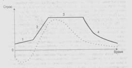 Рисунок 1. Традиционная модель жизненного цикла товара: стадии внедрения (1), роста (2), зрелости (3) и спада (4) Конкуренция либо незначительна, либо отсутствует (особенно если товар принципиально новый и защищен патентом). Рынок обычно не сегментирован, выпускаются одна- две модели, проводится массовый маркетинг с некоторым уклоном в сторону потребителя-новатора. Количество торговых точек, через которые реализуется товар, невелико. Цена может устанавливаться престижно высокой или, наоборот, завлекающе низкой. С выполнением задач внедрения наступает стадия роста. Потребитель познакомился с товаром и начал предъявлять все растущий спрос. Быстрыми темпами возрастает сбыт, растет и прибыль. Капиталовложения перестают носить характер рискоинвестиций. Одновременно усиливается конкуренция: растущие прибыли привлекают те фирмы, которые прежде занимали выжидательную позицию. Задача маркетинговой деятельности - расширение сбыта и углубление ассортимента. Появляется большое количество моделей и модификаций для разных сегментов рынка, соответственно расширяется диапазон цен. Возрастает число торговых точек. Третья стадия - зрелости - отмечается насыщением рынка. Рост прекращается, так как все категории потенциальных потребителей уже познакомились с товаром, eгo приобрели все, кроме тех, кому он, в принципе, не нужен. Но не сокращается уровень продаж - он стабилизируется на самом высоком уровне: ведь внутри тех же сегментов появляются все новые потребители (подрастают дети, образуются новые семьи, люди переезжают на новое место жительства, меняют изношенную товарную единицу на новую или, переходя из сегмента в сегмент, приобретают более соответствующую новому положению модель и т.д.). Строго говоря, объем продаж должен даже возрастать - с ростом населения. На этой стадии максимизируются количество охваченных рынком товара сегментов, разнообразие ассортимента и цен, число торговых точек. Максимальной становится и конкуренция, поскольку на рынок проникает множество фирм. В связи с этим прибыли - и на единицу продукции, и суммарные - начинают уменьшаться. Цель маркетинговой деятельности на стадии зрелости - как можно дольше сохранить имеющиеся преимущества и вообще максимально продлить эту стадию. Четвертая стадия - слад - наступает по одной из двух причин. Наиболее распространенная из них - моральное устаревание, т.е. появление в ходе научно-технического прогресса нового товара, который, выполняя аналогичные функции и сохраняя все (или почти все) свойства старого, обладает и некоторыми дополнительными. Если старый товар обладает какими-либо, пусть второстепенными, свойствами, которых нет у нового, тo он не исчезнет - просто сузится сфера его применения, как это произошло, например, со свечами, с черно-белым кино и фотографией и многим другим. Таким свойством, долго удерживающим морально устаревший товар на рынке, может быть и относительная дешевизна. Вторая возможная причина спада, также очень важная и к тому же обладающая совершенно недостаточно изученными закономерностями, -простая смена моды, когда пришедший на смену товар никакими объективными преимуществами не обладает. На стадии спада возможны разные варианты стратегии. Самое простое – это при первых признаках спада уйти с рынка, прекратив производство данной продукции и п