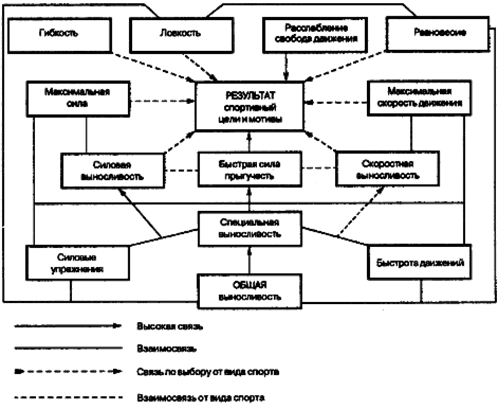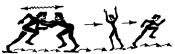 Рис. 6 Условная схема связей физических качеств (при достижении спортивных результатов, укреплении здоровья) Как видим, общая выносливость служит с одной стороны своего рода базой для успешного развития остальных физических качеств, с другой стороны – систематическое выполнение упражнений различной направленности вносит свой вклад в развитие общей выносливости, обеспечивая повышенную работоспособность задействованных систем организма спортсмена. Многократное повторение силовых или упражнений на быстроту движений формирует свои разновидности специальной выносливости, силовую или скоростную, а также максимальную силу или максимальную скорость движений (бег, метание легких предметов), а их повторение в сочетании и чередовании развивает быструю силу «взрывную», которая проявляется в форме прыгучести или хлестообразной силы метателей. Специальное овладение расслаблением и развитие свободы движений необходимо. Оно достоверно связано с достижением высоких результатов во всех видах легкой атлетики, в то же время специальная гибкость, ловкость и равновесие зависят только от потребностей результата – соревновательного упражнения. Также необходимо учитывать следующее. Помимо сходства с вашим соревновательным упражнением, его тренировочным вариантом или его частью, может быть очень полезно добиваться и чаще использовать небольшое (оптимальное) превышение на 5–10% в характере выполнения каждого специального упражнения по амплитуде, усилиям и быстроте, по продолжительности (числу повторений), темпу, ритму, и другим внешним воздействиям (отягощения, наклонная дорожка и прочие). Только в этих условиях возможно эффективное развитие и ваш надежный прогресс в спортивных результатах. Каждое упражнение иллюстрируется одним или несколькими фигурками с кратким их описанием. Описание отражает характер движений, а для краткости изложения на рисунках даны четкие обозначения некоторых условий – заданий, требований и особенностей их выполнения: – стрелками