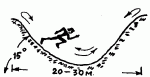 Рис. 5. Преодоление барьера в беге на 400 м (женщины) Примерная длина шагов при беге между барьерами в 15 шагов (в см): сход с барьера-115, 160, 210, 215, 215, 215, 215, 220, 220, 220, 220, 220, 220, 215, 215, 205; отталкивание на барьер – 200; в 13 шагов между барьерами: сход с барьера –140, 180, 228, 235, 240, 246, 247, 255, 257, 255, 258, 250, 254, 230; отталкивание на барьер – 225. Перемена ритма бега по дистанции (например, с 13 беговых шагов между барьерами на 14 или с 15 на 16, затем на 17) требует умения преодолевать препятствия с любой ноги. Преодоление препятствия. На дистанции 400 м барьеристам приходится бежать по двум прямым и двум поворотам. Основную техническую трудность для барьеристов представляет бег по повороту. При беге по повороту барьеристам целесообразнее бежать ближе к внутреннему краю беговой дорожки, для чего выгоднее отталкиваться правой ногой. В этом случае маховая нога (левая) пройдет над внутренним краем барьера, толчковая – над планкой барьера без риска нарушить правила преодоления препятствий. Отталкиваясь при беге по повороту правой ногой, барьерист имеет также преимущество в использовании центробежной силы: для этого он несколько наклоняется внутрь. Отталкиваясь на барьер левой ногой при беге по повороту, спортсмен, чтобы не нарушить правила, вынужден несколько отходить вправо от края дорожки; таким образом, ему приходится преодолевать большую (на 2–5 м) дистанцию. Высота препятствий в беге на 400 м (91,4 см у мужчин и 76,2 см у женщин) позволяет преодолевать их без заметных колебаний ОЦМТ в вертикальном и переднезаднем направлении; наклон туловища барьериста при преодолении препятствия близок к беговому. Работа рук осуществляется таким образом, чтобы сохранить равновесие и удержать туловище в правильном положении (при беге по повороту наклон несколько внутрь); при отталкивании правой ногой на повороте необходимо удлинять правой рукой движение вперед-внутрь и укорачивать движение назад-наружу, левая рука удлиняет движение локтем назад-вверх и укорачивает вперед-влево. Финиширование. Финишный отрезок (40 м – 1/10 часть дистанции) преодолевается с полной концентрацией усилий, с ускорением, близким к спринтерскому бегу. Обычно этот отрезок пробегается за 15–17 шагов (мужчины) и за 17–20 шагов (женщины). Время преодоления барьеров в беге на 400 м спортсменами различного уровня подготовленности дано в табл. 5 и 6. Таблица 5. Ориентировочное время по дистанции (мужчины), с
