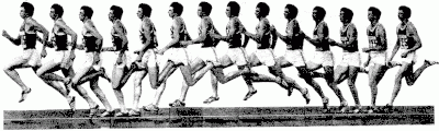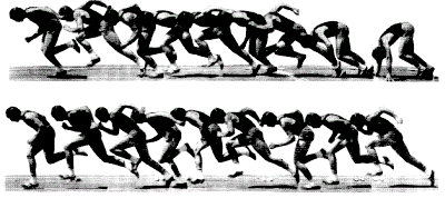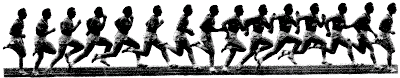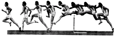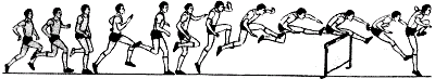 Рис. 4. Преодоление барьера в беге на 400 м (мужчины) Бег по дистанции. Расстояние между барьерами 35 м спортсмены преодолевают на разных участках дистанции за 13–17 беговых шагов. Очень часто спортсмены используют на дистанции смену ритма, т.е. начинают дистанцию, выполняя 13 (мужчины) и 15 беговых шагов (женщины) между барьерами, затем переходят на 14 и 16 шагов (соответственно), барьеры на последней прямой преодолевают в 15, 17 и более шагов. Наиболее распространенные варианты бега на 400 м с барьерами: 21 шаг до 1-го барьера, 13 шагов между барьерами, 15 шагов на финишных 40 м (рекордсмен мира Э. Мозес – 47,02 с); 21 шаг, 13, 13, 13, 13, 14, 14, 14, 14, 14, 17 шагов (рекордсмен СССР А. Васильев – 47,92 с); 23 шага до 1-го барьера, 15 шагов между барьерами, 21 шаг на финишном отрезке (экс-рекордсменка мира М. Пономарева – 53,58 с); 24 шага до 1-го барьера, до 5-го расстояния преодолеваются в 17 шагов, до 8-го – в 18, до 10-го – в 19 шагов, 20 шагов на финишном отрезке (А. Амбразене – 54,02 с).