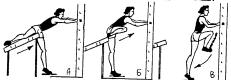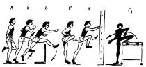 Начало атаки барьера спортсмены выполняют быстрым движением вперед-вверх согнутой в колене маховой ногой. Опорная нога, активно выпрямляясь, заканчивает отталкивание, а наклон туловища увеличивается. Максимально широкое разведение ног во «входе» на барьер сменяется их активным сведением: опускается за барьер маховая нога и проносится толчковая быстро, но плавно, широким дугообразным движением через сторону. Барьеристы приземляются упруго на переднюю часть стопы, сохраняя значительный наклон тела и стремление к движению вперед. Продолжается энергичное движение вверх-вперед толчковой ноги. Если при приземлении равновесие и контроль над движением сохраняется, лучшей техникой будет та, которая требует меньше времени на полет в воздухе над барьером. 2.4 Обучение технике барьерного бега Ниже приводится методика Е.Е. Аракеляна, Е.А. Разумовского, Л.А. Череневой, описанная в учебнике «Легкая атлетика» (под ред. Н.Г. Озолина, В.И. Воронкина, Ю.Н. Примакова, Москва, 1989) Задача 1. Создать у занимающихся представление о правильной технике барьерного бега. Средства. Наглядный пример бега барьериста высокой квалификации, показ видеозаписи, киносъемки с обязательной демонстрацией целостного бега, а не отдельных фиксированных его положений. Методические указания. Преподаватель должен обратить внимание на самые важные моменты: высокую скорость и динамичность бега между барьерами, т.е. на шаговое движение через барьер, общую координацию движений. Задача 2. Научить правильному переходу через барьер. Средства. Специальные упражнения барьериста на месте (рис. 65) и в движении на дорожке. 1. Стоя на толчковой ноге перед барьером на расстоянии 30–40 см, поднять бедро маховой ноги до горизонтального положения, подняться на носок опорной ноги и, выпрямляя маховую ногу, опустить ее за барьер. Одновременно быстро перенести согнутую в колене толчковую ногу через барьер параллельно его планке и, сразу же выведя колено вперед, сделать шаг за барьером. 2. Пройти через 4–5 барьеров, удаленных друг от друга на 2–3 м, и выполнить это упражнение в ходьбе и беге с высоким подниманием бедра, перенося толчковую ногу через барьер, как и в первом упражнении. Высота барьеров подбирается индивидуально. Методические указания. Следить за синхронностью действий маховой и толчковой ноги, за активным продвижением таза вперед. Акцентировать внимание на выполнении загребающего движения при опускании маховой ноги. Руки работают как при обычном беге. При опускании маховой и выносе вперед толчковой ноги выводится вперед противоположная рука, согнутая так, чтобы локоть ее приблизился к колену толчковой ноги. Это действие приучает к правильному выносу вперед толчковой ноги и в то же время к сохранению наклона туловища. Задача 3. Научить ритмичному бегу с барьерами. Средства. Бег с барьерами в 3 шага при их сближенной расстановке – для бегунов на ПО и 100 м, в 5, 7, 10, 12 шагов – для бегунов на 400 м. 1. С 6–7 шагов разбега пробежать через 3–4 барьера. Высота барьера занижена, расстояние между барьерами подбирается индивидуально. 2. То же с 7–8 шагов разбега через 4–5 барьеров с постепенным их повышением до стандартной высоты и увеличением расстояния между ними. Методические указания. Важно следить за тем, чтобы спортсмены не отталкивались близко к барьеру, не прыгали высоко через них, естес
