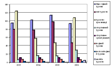 3.4 Спортивний туризмСеред різноманітних засобів виховання і навчання, які має сучасна педагогіка, чільне місце належить дитячо-юнацькому туризму. Туристські походи сприяють вихованню в учнів кращих людських якостей: дружби, взаємодопомоги, мужності, умінь долати труднощі, формують важливі позитивні риси характеру. Розвиток різних видів туризму в Україні сприяє кращому задоволенню запитів учнівської молоді. Найбільш масовим видом спортивного туризму як в Україні, так і в області, є пішохідний туризм. При центрах туризму діють гуртки пішохідного, велосипедного, водного туризму та спортивного орієнтування. У 2006-2007 навч. році в загальноосвітніх та позашкільних навчальних закладах області працювало 301 бюджетний туристсько-спортивний гурток, в яких навчалось 4750 учнів (в ПНЗ Центрі ДЮТЕ - 44 гуртка (597 учнів), в інших закладах області - 257 гуртків (4153 учня)). Серед учнівської молоді та педагогів області проводяться змагання, чемпіонати, матчеві зустрічі, навчально-тренувальні збори, туристські походи тощо. Традиційними є змагання з техніки пішохідного туризму та спортивного орієнтування. Майже всі райони області проводять свої туристські зльоти. Найбільш поширеними в області є змагання зі спортивного туризму серед команд учнів навчальних закладів Чернігівщини, присвячені Дню Перемоги (380/чоловік), відкрита Першість Чернігівської області зі спортивного туризму (90 чоловік), змагання зі спортивного туризму серед педагогічних працівників навчальних закладів Чернігівщини, присвячені Всесвітньому Дню туризму та Дню вчителя (1053 чоловік). Кількість гуртків спортивного напрямку у 2003-2006 роках.