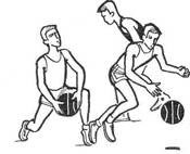 Рис 9. Бросок в корзину одной рукой снизу. Бросок двумя руками сверху выполняется аналогично броску одной рукой. Различие состоит в том, что мяч поднимается над головой обеими руками, согнутыми в локтевых суставах, кисти обхватывают мяч так, что большие пальцы направлены друг к другу, а остальные вверх. Бросок двумя руками снизу в ходе игры чаще всего выполняется при стремительных проходах под щит. Техника его выполнения не отличается от техники броска одной рукой снизу, только мяч выпускается двумя руками. Добивание мяча выполняется одной (двумя) руками в прыжке, после того как мяч отскакивает от щита или пролетает вблизи корзины. Прыгнув вверх, игрок принимает мяч на раскрытую кисть руки, слегка согнутой в локте, и толкает его в корзину. Броски сверху вниз и добивание мяча имеют большое значение во время активной борьбы с противником под щитом. Ведение мяча. Ведение мяча - прием (классификация ведения мяча представлена на рис.10), дающий возможность игроку двигаться с мячом по площадке с большим диапазоном скоростей и в любом направлении. Ведение позволяет уйти от плотно опекающего защитника, выйти с мячом из-под щита после успешной борьбы за отскок и организовать стремительную контратаку. С помощью ведения можно поставить заслон партнеру или, наконец, отвлечь на время соперника, опекающего партнера, чтобы затем передать ему мяч для атаки. Во всех остальных случаях злоупотреблять ведением не следует, чтобы не снижать быстроту контратак и не нарушать ритма игры. Ведение осуществляется последовательными мягкими толчками мяча одной рукой (или поочередно правой и левой) вниз-вперед несколько в сторону от ступней. Основные движения выполняют локтевой и лучезапястный суставы. Ноги необходимо сгибать, чтобы сохранять положение равновесия и быстро изменять направления движения. Туловище слегка подают вперед; плечо и рука, свободная от мяча, должны не допускать соперника к мячу (но не отталкивать его!). Для ведения характерна синхронность чередования шагов и движений руки, контратакующей с мячом. Игрок, продвигаясь таким образом, должен в то же время следить за расположением партнеров и соперников и ориентироваться на щит. Целесообразно периодически переключать зрительный контроль с мяча на поле и обратно (рис. 11). Баскетболист при ведении обязан одинаково хорошо владеть правой и левой рукой. Обводка с изменением скорости. К неожиданным изменениям скорости ведения мяча прибегают для того, чтобы оторваться от защитника. Скорость ведения зависит прежде всего от высоты отскока мяча от площадки и угла, под которым он направляется к площадке. Чем выше отскок и меньше его угол (в рациональных пределах), тем больше скорость продвижения. При отскоке, низком и близком к вертикальному, ведение замедляется и может вообще выполняться на месте. Обводка с изменением направления. Ее используют главным образом для обводки соперника и проходов для атаки кольца. Изменяют направление таким образом: кисть накладывают на различные точки боковой поверхности мяча и выпрямляют руку в нужном направлении. Используют также обводку с изменением высоты отскока и с поворотами и переводами мяча. Широко используется также способ обводки соперника с переводом мяча с одной руки на другую, скрытно, за спиной или под ногой (рис 12).