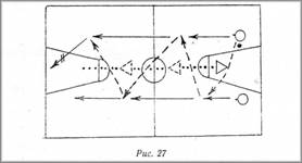 6. Вихідне положення, як у вправі 3, після передачі м'яча в стінку баскетболіст бере другий м'яч, підкидає його вгору перед собою. Після торкання першим м'ячем майданчика гравець ловить його і знову скеровує в стінку, після чого ловить другий м'яч, підкидає його вверх і т. д. (рис. 22). 7. Вихідне положення, як у попередній вправі, тільки у гравця один м'яч. Після передачі в стінку1 спортсмен виконує поворот на 360° і ловить м'яч без попереднього удару об майданчик. Після передачі він виконує один поворот праворуч, а один ліворуч і т. д. 8. Два м'ячі, дві стінки (рис. 23). Стоячи в куті, в 2—3 м від кожної стінки, баскетболіст по черзі посилає м'яч в одну, другий в другу стінку. 9. Гравець стоїть обличчям до тренувальної стінки на відстані 1 м. Одночасно передає два/ м'яча в стінку правою і лівою рукою в стрибку. 10. Ведення м'яча на оптимальній швидкості вздовж тренувальної стінки, після 2—3-х торкань м'яча виконується передача та ловля м'яча в русі і т. д. Орієнтовні вправи з партнером 1. Передача м'яча в парах різними способами з постійною зміною відстані між партнером. 2. Передача м'яча в стрибку зумовлену, кількість разів. 3. Передача в парах з пересуванням від корзини до корзини з кидком в русі. 4. Гравці на лініях штрафних кидків протилежних сторін майданчика, у кожного м'яч. Передача м'яча один одному, намагаючись скерувати його точно в 3-секундну зону. 5. Два баскетболісти з м'ячем в руках стоять один навпроти другого на відстані 4 м. За сигналом один передає м'яч з ударом об майданчик, другий — без торкання майданчика, у повітрі. 6. Вихідне положення, як у вправі 5. Спортсмени пересуваються від лицьової лінії до протилежної корзини, застосовуючи передачу м'яча довільним способом з завершальними кидками в кільце у русі. 7. Гравець з м'ячем на лицьовій лінії, партнер — на лінії штрафного кидка. За сигналом спортсмен без м'яча стрімко біжить у протилежному напрямку, гравець з м'ячем починає ведення, на лінії штрафного кидка виконує передачу в русі партнеру, який, оволодівши м'ячем, виконує кидок у стрибку. Орієнтовні вправи з партнером і умовним суперником 1. Гравці на лицьовій лінії. На середині майданчика від лінії до лінії штрафних кидків через 3—4 м стоять 5—6 стояків (рис. 24). На максимальній, швидкості баскетболісти передають м'яч один одному так, щоби м'яч не торкнувся стояка. 2. На майданчику в три ряди через 3—4 м розташовано стояки. Гравці на лицьовій лінії за сигналом біжать, оминаючи стояк, до середини майданчика. Другий спортсмен, після обведення стояка передає м'яч партнеру, а сам стрімко біжить, оминаючи стояки, до середини майданчика, де одержує м'яч від партнера і т. д. Передачі закінчуються кидком у корзину в русі (рис. 25).