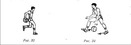 Успішно застосовують і переведення м'яча між ногами. Вперше цей прийом використав американський баскетболіст Юліус Ірвін. Ногу, однойменно з рукою, що веде м'яч, гравець ставить так, щоби подолати інерцію поступального руху, і в такому положенні посилає м'яч між ногами (рис. 34). Вдосконалюючи ведення м'яча, спортсмен повинен пам'ятати, що вправи треба виконувати з піднесеною головою, дивитися вперед, а при чередуванні ведення і зупинок, зміні напрямку та інших прийомів, намагатися зберігати рівновагу та контроль за м'ячем. Якщо суперник або умовний суперник поруч, доцільно посилити контроль за м'ячем, застосовуючи ведення із заниженням відскоку, прикриваючи м'яч тулубом, контролюючі м'яч дальшою від суперника рукою. Орієнтовні вправи без суперника 1. Ведення м'яча на місці, чергуючи високий віденок з низьким. Вправу виконують поперемінно правою і лівою рукою. 2. Ведення на місці двома м'ячами правою і лівою рукою. При можливості міняти висоту відскоку, не перериваючи ведення. 3. Вести м'яч у прийнятій стійці, посилаючи першим поштовхом вперед, а другим назад. Вправу виконують поперемінно правою і лівою рукою. 4. Ведення м'яча: а) навколо ноги (рис. 35), виставивши вперед праву ногу. Правою рукою вести м'яч навколо правої ноги в одну, а потім в іншу сторону. Так само вести м'яч лівою рукою навколо виставленої лівої ноги; б) ведення навколо обох ніг (рис. 36). Поставити ноги на ширину плечей, спочатку вести в одну, потім в другу сторону; в) ведення вісімкою (рис. 36). Ця вправа допомагає вдосконаленню прийомів техніки захисту.