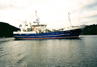 Рис.2 Траулер с кормовым тралением. Разноглубинное траление рыбыРазноглубинное траление рыбы производится с целью вылова больших косяков морской рыбы и других морепродуктов, обитающих на разных уровнях морской среды между океаническим дном и водной поверхностью. В нём принимает участие тот же тип судов, что и при постановке донных тралов на рыбу, но в данном случае эти суда обычно оборудуют ещё и большими сетными тумбами для замётывания в воду ещё больших сетей. Для того, чтобы регулировать глубину подводного траления морской рыбы, поверх перлиня закрепляются специальные грузила и поплавки, а сам невод оборудуется специальными сетевыми распорками. Ловля рыбы с помощью кошелькового невода (обкидные неводы) Сейнеры, оборудованные кошельковыми неводами, выходят на промысел в море с целью вылова таких косяковых пород рыбы, как сельдь, мойва и макрель. Уловы могут быть очень большими, поэтому большое значение имеет высокая грузоподъемность судна. К верхней части рыболовной сети крепятся поплавки, а к нижней - грузила. Поскольку от судна требуется закинуть сеть таким образом, чтобы в центре обкидного невода оказался сразу весь косяк морской рыбы, необходима также хорошая маневренность судна и, особенно, его способность совершать различные повороты и развороты. Существует два типа сейнеров, оборудованных для кошелькового лова морской рыбы. Один из них получил название американского, а другой североевропейского (нордического) сейнера. На обоих типах сейнеров используются силовые установки с гидравлической системой привода. На судах американского типа капитанский мостик и кубрик для членов судовой команды расположены в носовом отсеке, а силовой блок портального крана с грузовой стрелой смонтированы сзади навесной палубы в кормовом отсеке корабля. Сейнеры нордического типа первоначально напоминали суда, оборудованные для бокового траления рыбы. У них навесная палуба, рулевая рубка и кубрик для судовой команды расположены в кормовом отсеке корабля. Блок силового питания обычно располагается по правому борту от рулевой рубки [8,11]. Транспортер с гидравлическим приводом перемещает рыболовные снасти от блока питания к сетному бункеру в кормовом отсеке. После того, как невод накрывает косяк рыбы сверху, сетевой куль стягивается снизу кошельковой лебёдкой, на которую наматывается нижний трос. На следующем этапе начинается перекачка рыбы из кошелькового невода в трюм через сепаратор, разделяющий рыбу и воду. У заново спроектированных и построенных сейнеров нордического типа теперь, как правило, те же габариты, что и у больших траулеров с кормовым тралением. Двойная подвесная палуба пересекает судно от носового до кормового отсека, а сетный бункер располагается на корме. Расположение силового блока питания по-прежнему такое же, как и на первоначальной модели судов этого типа.