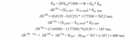 Возьмем за основу расчета показатели за 2007 г. по отношению к 2006г. г. Рассмотрим влияние сначала изменения среднегодовой численности на изменение количества рожденных: