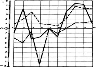 Pиc. 5. Профиль промеров чукотско-ненецких самцов(А) и самок (Б) (100% - ненецкие сверстники): . ‑ . ‑ . ‑ при рождении, —— ‑ в 6-месячном возрасте, ‑ ‑ ‑ ‑ ‑ в 18-месячном возрасте. 1 – высота в холке; 2 ‑ обхват груди; 3 – косая длина туловища; 4 – высота в локте; 5 – обхват пясти; 6 – длина головы; 7 – глубина груди; 8 – ширина груди; 9 – ширина в маклоках; 10 – косая длина зада. Контрольный убой оленей в 18-месячном возрасте показал, что помесные животные сохраняют преимущество над местными сверстниками по убойным качествам. Так, по предубойной живой массе чукотско-ненецкие самцы превзошли ненецких на 4,2 кг (td=2,2), по массе туши – на 2,4 кг (Р<0,05) и убойному выходу – на 0,5 % (td=1,1). У самок разница в пользу помесей по предубойной массе и массе туши оказалась одинаковой – 2,4 кг и статистически недостоверной, по убойному выходу превосходство помесей – 2,6% статистически достоверно (Р<0,05).В 18-месячном возрасте самцы превосходили самок по предубойной массе и массе туши, но уступали по убойному выходу на 2,2 % в контрольной и 3,3 % - в опытной группе, что объясняется снижением упитанности самцов в период гона. Формирование мясной продуктивности у северных оленей различного происхождения имеет свои особенности, характерные как для самцов, так и для самок. Это наглядно прослеживается при сравнении сортового и морфологического состава туш (табл. 11 и 12). При убое оленей в 6-месячном возрасте в составе туш чукотско-ненецких самцов обнаружено больше мышечной ткани на 1,91% (Р<0,01), жировой – на 0,62% (td=1,5), меньше костно-хрящевой на 1,65% (Р<0,05), соединительной – на 0,50% (Р<0,01). В тушках самок разница составила соответственно 0,85 (Р<0,05), 1,19 (Р<0,01), 1,69 (Р<0,01) и 0,35% (Р<0,05). Таблица 11 - Сортовой и морфологический состав туш чукотско-ненецких помесей 1-го поколения