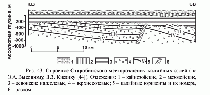 На Старобинском месторождении, расположенном в северозападной части Припятского прогиба, — четыре калийных горизонта, из которых два (второй и третий) отрабатываются, а первый находится в опытно-промышленной разработке. Основным объектом эксплуатации является третий горизонт, залегающий на глубине 450—1000 м и более и имеющий мощность до 20 м. Мощность продуктивного пласта в разрезе этого горизонта 4-5, 5 м; в его разрезе выделяется до шести сильвинитовых слоев. Средние содержания КС1 в этих слоях колеблются от 30 до 45 %. Второй калийный горизонт распространен на меньшей площади и залегает на глубинах 360-700 м. Мощность его 1, 3—2, 8 м. Разрез горизонта обычно состоит из двух сильвинитовых слоев; содержание КС1 в них в среднем составляет 34^11 %. Месторождение разрабатывается четырьмя рудоуправлениями РУП «ПО «Беларуськалий». На четырех шахтных полях этих рудоуправлений балансовые запасы сырых калийных солей категорий A+B+Cj составляют 2, 7 млрд т. Начинается подготовка к строительству пятого рудоуправления. Петриковское месторождение расположено на западе центральной зоны Припятского прогиба. Здесь в калиеносной подтолще верхней солевой толщи выявлено около 20 калийных горизонтов. Промышленное значение имеет только один из них, залегающий на глубине 520-1200 м. Мощность его варьирует от 3 до 25 м. В его разрезе, в свою очередь, промышленное значение имеет нижний пласт с содержанием КС 1, достигающим 40—5 5 %. В калийных рудах Петриковского месторождения повышенные концентрации MgCl2 (1, 5—5, 5 %) и низкие содержания нерастворимого остатка (0, 5—1, 5 %). Балансовые запасы сырых калийных солей категорий Cj+C2 составляют 1, 28 млрд т. Петриковское месторождение по сравнению со Старобинским характеризуется более сложными горно-геологическими условиями: промышленный горизонт залегает глубже, углы падения слоев более крутые. Благоприятными факторами являются низкое содержание нерастворимого остатка и высокая концентрация КС1 в рудах. Для введения в эксплуатацию месторождения необходима доработка технологии обогащения руд, обладающих повышенным содержанием MgCl2. Октябрьское месторождение калийных солей расположено в центральной части северной зоны Припятского прогиба. Здесь два промышленных калийных горизонта, которые сложены красноцвет-ными сильвинитами с содержанием КС1 около 50 %; концентрация MgCl2 в них 0, 1 %, нерастворимого остатка около 5 %. Балансовые запасы сырых калийных солей, подсчитанные по категориям Cj и С2, составляют 637, 2 млн т. Несмотря на то, что Беларусь обладает очень большими запасами калийных солей, имеется целый ряд проблем, связанных с их добычей. Эти проблемы обусловлены наличием разломов в продуктивной толще, обводненностью перекрывающих глинисто-мергельных отложений надсолевого девона, а также нарастающим негативным влиянием калийного производства на окружающую среду, неизбежным при принятом способе отработки сильвинитов. Стратегия развития минерально-сырьевой базы калийной промышленности заключается не только в наращивании разведанных запасов, но и во внедрении новых технологий добычи калийных солей, в частности метода подземного выщелачивания. Этот прогрессивный метод, дающий большой экономический эффект и оказывающий минимальное негативное воздействие на окружающую среду, нашел применение при разработке калийных залеже