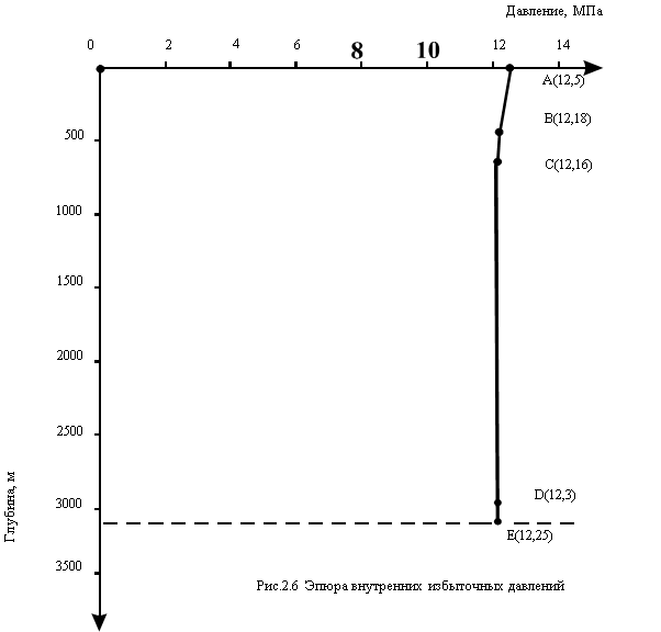 При Z=L=2825м: РHИL =28,5-10-6 ×1,0×104 × (2825 - 2250) =22,75 МПа. в) Определяется избыточное наружное давление при освоении скважины: в незацементированной зоне по формуле (2.80): При Z=0: РНИZ=0. При Z=h=400м: РHИh=10-6×1,08 ×104 ×400=4,32 МПа. в зацементированной зоне по формуле (2.81): При Z=L0=600м: РHИL0 = РHL0=6,34 МПа. При Z= S1=2770м: РHИS1 =27,9-10-6 ×1,0×104 × (2770 - 1830) =18,55 МПа. При Z=L=2825м: РHИL =28,5-10-6 ×1,0×104 × (2825 -1830) =18,6 МПа. г) Определяется избыточное наружное давление по окончании эксплуатации скважины: в незацементированной зоне по формуле (2.80): При Z=0: РНИZ=0. При Z=h=400м: РHИh=10-6 ×1,08 ×104 ×400=4,32МПа. в зацементированной зоне по формуле (2.81): При Z=L0=600м: РHИL0 = РHL0=6,34 МПа. При Z= S1=2770м: РHИS1 =27,9-10-6 ×0,95×104 × (2770 - 2590) =26,2 МПа. При Z= 2825м: РHИZ =28,5-10-6 ×0,95×104 × (2825 - 2590) =26,3 МПа, при РHZ=РПЛZ. При Z= 2770м: РHИZ =28-10-6 ×0,95×104 × (2770 - 2590) =26,2 МПа, при РHZ= =10-6× qГС×Z. При Z=L=2850м: РHИL =28,7-10-6 ×0,95×104 × (2825 -2590) =26,3 МПа, при РHL=10-6× qГС×L. Эпюры наружных избыточных давлений строятся для периодов, когда наружные избыточные давления достигают максимальных значений (испытание колонны на герметичность снижением уровня и период окончания эксплуатации скважины). Строятся эпюры ABCDE ABCDIGGIF соответственно рассчитанным значениям наружных избыточных давлений для периодов испытания колонны на герметичность снижением уровня и конца эксплуатации скважины, рис.2.5 Рассчитывается избыточное внутреннее давление при испытании обсадной колонны на герметичность снижением уровня в один прием без пакера. а). В незацементированной зоне внутреннее избыточное давление определяется по формуле: РВИZ= РОП - 10-6 × (q Р - q Ж) × Z при 0 ≤Z≤h, (2.82) где РОП - минимальное давление опрессовки, МПа (РОП =12,5 МПа (см. табл.2.1 [12]). При Z=0: РВИZ=12,5 МПа. При Z=h=400м: РВИh=12,5 - 10-6 × (1,08 - 1,0) ×104 ×400=12,18 МПа. б). В зацементированной зоне внутреннее избыточное давление определяется по формуле: РВИZ= РОП + 10-6 × q Ж × Z - РРЛZ при 0 ≤Z≤h. (2.83) При Z=L0=600 м: РВИL0=12,5+10-6× 1,0 × 104× 600 - 6,34=12,16 МПа. При Z= S1=2770 м: РВИS1 =12,5+10-6× 1,0 × 104× 2770 - 27,9=12,3 МПа. При Z=L=2825м: РВИL =12,5+10-6× 1,0 × 104× 2825 - 28,5=12,25 МПа. Строится эпюра внутренних избыточных давлений ABCDE рис.2.6 Конструкция обсадной колонны характеризуется: типом труб (их соединений), наружным диаметром обсадных труб, толщиной стенок, а также материалом труб (группой прочности).