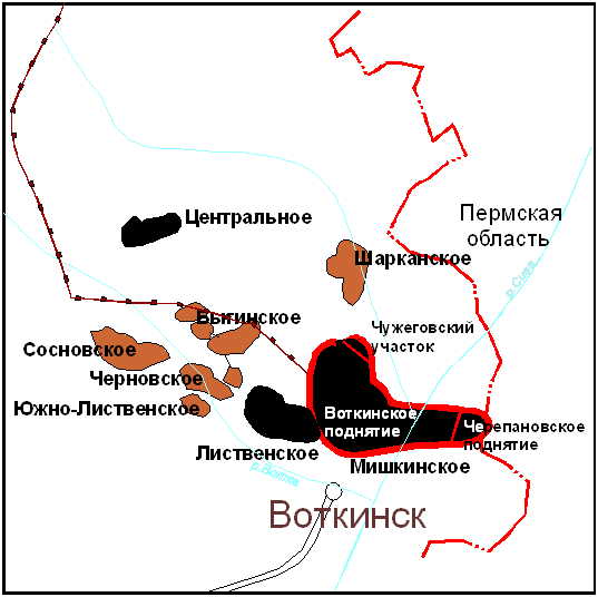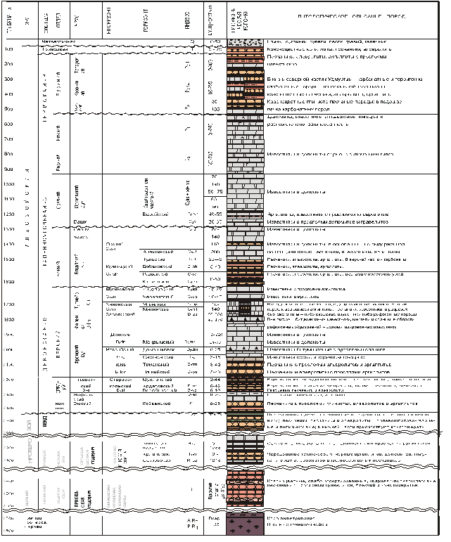 Климат района умеренно-континентальный, с продолжительной зимой. Среднегодовая температура +2°С, морозы в январе-феврале иногда достигают –40°С. Средняя глубина промерзания грунта 1,2 м, толщина снегового покрова в марте достигает 60-80 см. Площадь месторождения связана с г. Ижевском железной дорогой Ижевск-Воткинск и шоссейной дорогой областного значения Ижевск-Воткинск-Шаркан. С рекой Камой месторождение связанно шоссейной дорогой Воткинск-Чайковский. Судоходство по крупнейшей водной магистрали Европейской части России реке Каме производится в течение 6-6,5 месяцев. В экономическом отношении район сельскохозяйственный, большая часть занята пашнями, а склоны оврагов покрыты травянистой растительностью и кустарниками. Промышленность: легкая, машиностроительная, металлургическая концентрируется в г. Воткинске. Имеются предприятия по лесоразработки и торфодобычи. Воткинский район располагает месторождениями строительных материалов: кирпичные глины, песчано-гравийные смеси, строительного песка. Добычу нефти из Мишкинского месторождения ведет Воткинское нефтегазодобывающее управление. Водозабор для целей поддержания пластового давления (ППД) расположен на р. Сива. Источник энергоснабжения — подстанция 220/110/35/6 кВ «Сива». Подготовка нефти осуществляется на УПН-2 «Мишкино», которая расположена на территории Мишкинского месторождения. 1.2. Геолого-физическая характеристика Мишкинского месторождения1.2.1. Геологическое строение Мишкинского месторожденияМишкинская зона поднятий расположена в южной части Верхне-Камской впадины. В тектоническом отношении Мишкинское месторождение приурочено к одноименной антиклинальной структуре субширотного простирания, в юго-восточной части Киенгопского вала, представляющего собой крупную структуру, осложненную рядом брахиантиклинальных складок низшего порядка. К северо-западу от Мишкинской площади расположено Чутырско-Киенгопское месторождение, а восточнее – Ножовская нефтеносная зона поднятий Пермской области. Геологический разрез осадочного чехла в пределах Мишкинского месторождения представлен отложениями протерозойской группы, девонской, каменноугольной, пермской систем палеозоя и четвертичными отложениями (рис. 3).