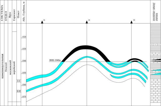 Рис. 3. Промышленная нефтеносность установлена в отложениях верейского горизонта, башкирского яруса среднего карбона, яснополянского надгоризонта и турнейского яруса нижнего карбона. Ниже будут приведены геологические и геолого-физические характеристики по каждой залежи отдельно. Московский ярус. Верейский горизонт. На Мишкинском месторождении в верейском горизонте московского яруса четко выделяются два продуктивных пласта В-II и В-III, сложенных карбонатными отложениями. Пласты разделены непроницаемой пачкой аргиллитов и глинистых известняков толщиной от 1,2 м до 2 м. Тип коллектора поровый, залежи пластово-сводовые (рис. 4).