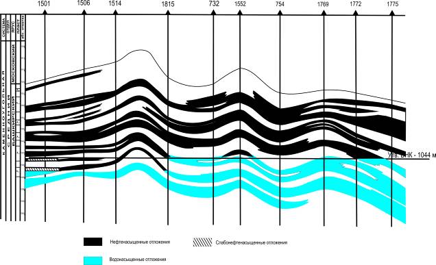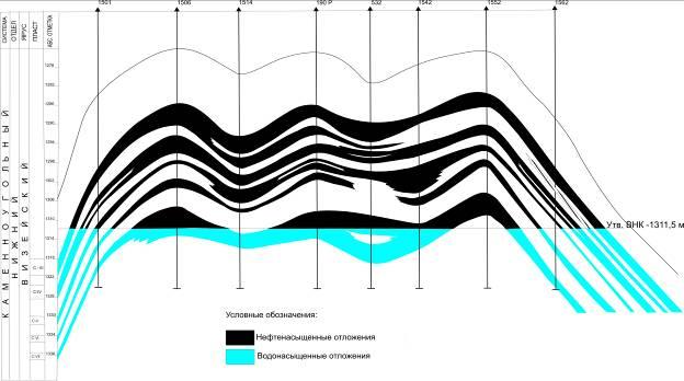 Рис. 6. Уровень ВНК башкирской залежи залегает на абс. отм -1046 м, -1044 м (Воткинское поднятие), -1046 м и -1064 м (Черепановское поднятие). Визейский ярус Нефтеносность доказана по пластам С-II, C-III, C-IV – тульский горизонт и С-V, С-VI, C-VII – бобриковский горизонт. Терригенные отложения визейского яруса представлены переслаиванием алевролитов, аргиллитов и песчаников. В верхней части яруса (тульский горизонт) преобладают глинистые разности, в нижней (бобриковский горизонт) – песчаники и алевролиты. Пласты коллекторы в пределах площади невыдержанны как по площади, так и по литологии. На небольших расстояниях песчаники замещаются алевролитами и глинистыми алевролитами. В среднем общая толщина терригенных отложений визейского яруса составляет 37 м, при изменении от 35 м до 43 м, средняя эффективная толщина 9,8 м, средневзвешенная эффективная нефтенасыщенная толщина - 4,8 м (рис. 7). Средневзвешенная по толщине пористость визейской залежи нефти составляет 20 %, нефтенасыщенность 71 %. Уровень ВНК на абс. отм. -1311,5 м , -1327,5 м. Схематический геологический разрез отложений визейского яруса