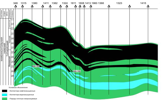 Рис. 7. Турнейский ярус Отложения черепетского горизонта представлены переслаиванием известняков большей частью глинистых, аргиллитов с подчиненными прослоями мергелей, доломитов. Глинисто-карбонатные отложения черепетского горизонта в целом являются непроницаемой покрышкой для залежи нефти малевско-упинского горизонта. Нефтенасыщен в черепетских отложениях пласт Т-3, пласты Т-1 и Т-2 сложены известняками заглинизированными. Основные запасы нефти в турнейском ярусе приурочены к пласту пористо-кавернозных известняков общей толщиной до 36 м, залегающему в кровле малевско-упинского горизонта. Пласт довольно хорошо выдержан по площади, средняя нефтенасыщенная толщина составляет 14,4 м. Покрышкой служат аргиллиты подошвы черепетского горизонта. В большинстве скважин прослеживаются среди пористых плотные разности известняков толщиной от 0,8 м до 8,0 м, коэффициент расчлененности равен 3,98. Залежь имеет массивное строение. В подошвенной части залегает прослой плотных (по промыслово-геофизическим данным) низкопроницаемых пород толщиной 3-10 м, отделяющий его от пластов Т-5, Т-6. Однако анализ кернового материала из этого прослоя, выполненный в Пермском отделении ВНИГНИ, свидетельствует о наличии в нем трещиноватости. Коллектора характеризуются высокой послойной и зональной неоднородностью и сравнительно невысокими фильтрационо-емкостными свойствами. Пористость в среднем составляет 16%, проницаемость – 0,213 мкм2. Средняя нефтенасыщенная толщина 14.4 м. Средневзвешенная по толщине нефтенасыщенность 75 %. Уровень ВНК установлен на абс. отм. -1352-1356 м (рис. 8).