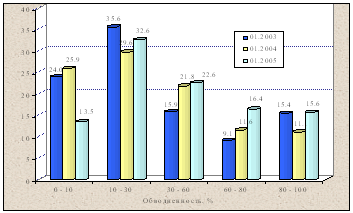 Рис. 3.4. Распределение действующего фонда скважин Хохряковского месторождения по обводненности за 2003-2004 г.г.